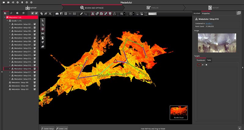 De regreso en la oficina, los datos de la nube de puntos obtenidos con el BLK360 y el RTC360 se registraron con Cyclone REGISTER 360. Se comprobaron y procesaron los datos GNSS con el software Infinity. En el proyecto GNSS se importaron también los datos del DISTO. Junto con Spelemat, Top Geocart generó una nube de puntos unificada, como un proyecto Cyclone REGISTER 360, y se exportó en los formatos E57 y LGS para visualizarlos con JetStream Viewer, una herramienta sencilla para visualizar puntos de la nube. El archivo E57 se importó a Leica Cyclone 3DR para crear mallas y calcular modelos digitales del terreno (MDT) a partir de las nubes de puntos.